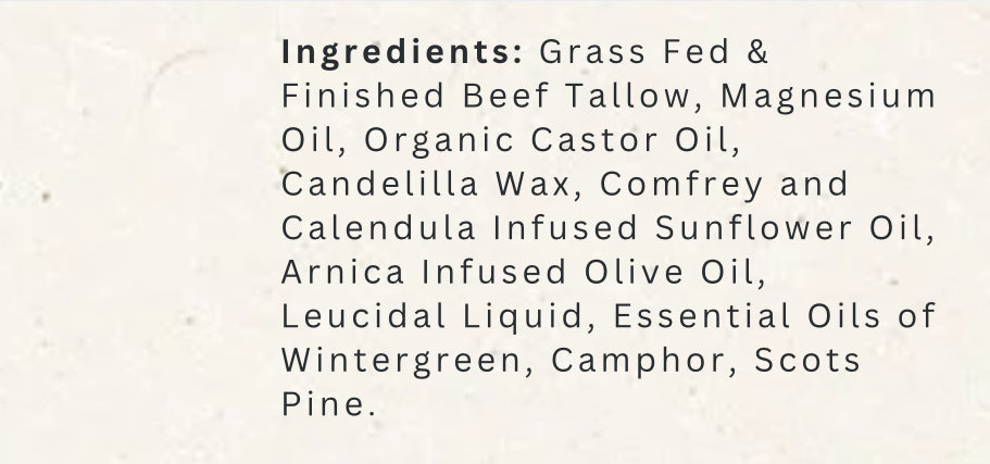 Handcrafted in small batches with grass-fed tallow, magnesium oil, and herbal infusions of arnica, comfrey, and calendula, this rich, creamy formula absorbs easily into the skin without leaving a greasy residue. A focused blend of white camphor, wintergreen, and Scots pine essential oils adds a cooling, therapeutic boost — perfect for tired muscles, post-workout care, or daily tension relief.