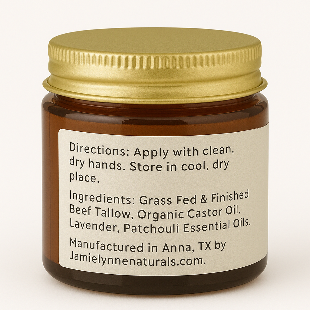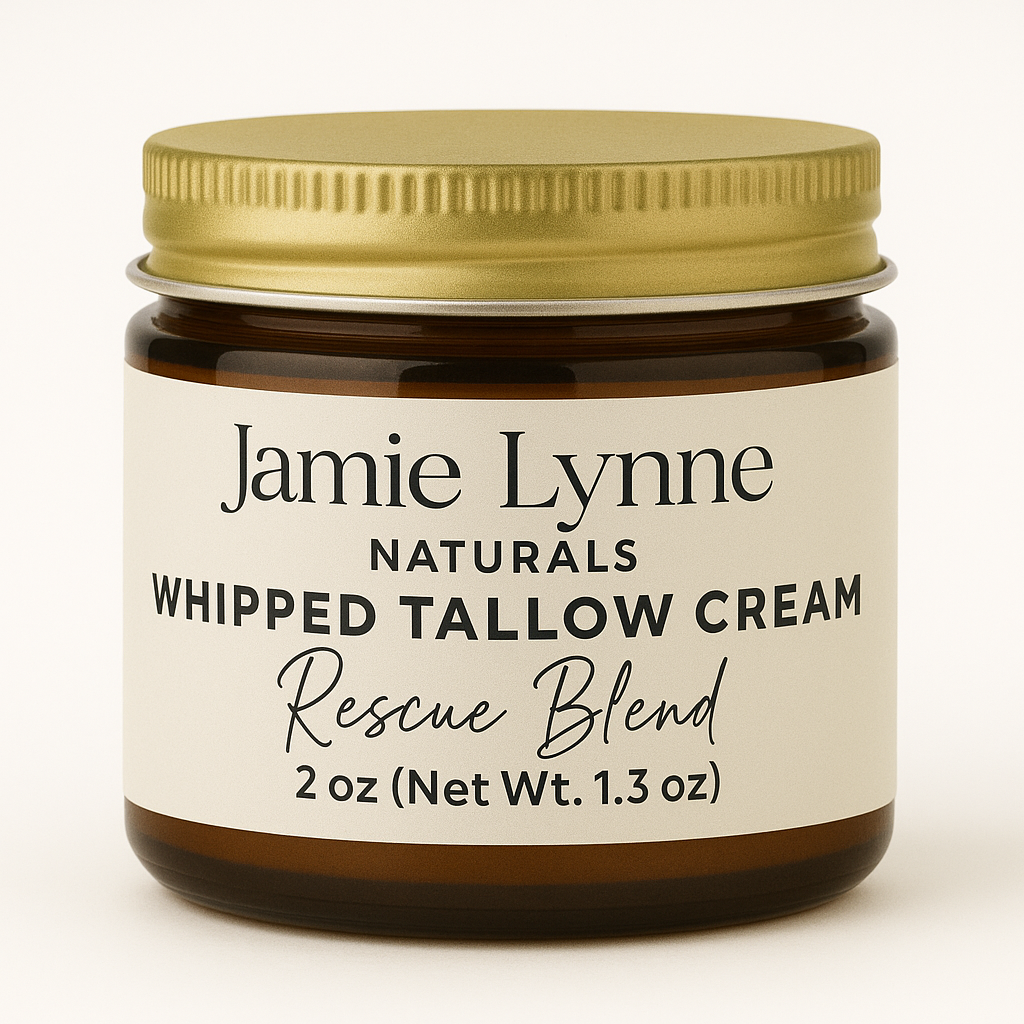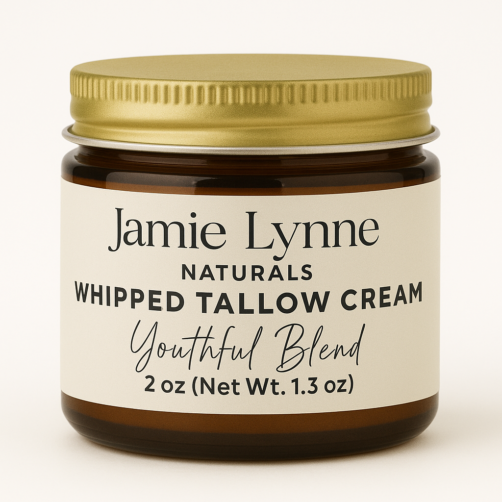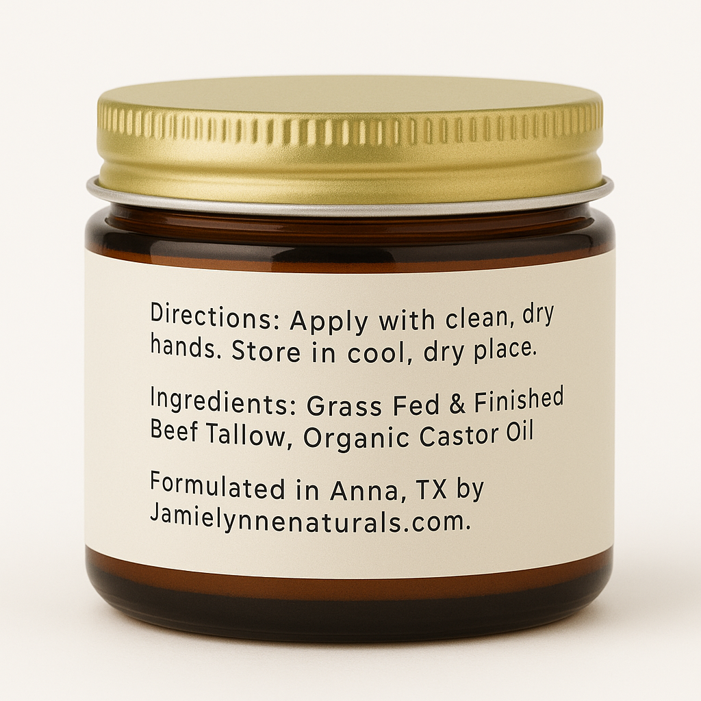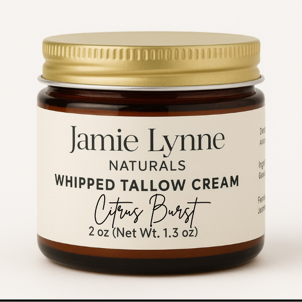 Improve your skin's health with nourishing Whipped Tallow Cream. Made with 100% grass fed and finished beef tallow from liver and kidney suet, organic castor oil, and your choice of therapeutic essential oils, this cream comes in three convenient sizes and a glass amber jar. Use it on your face, hands, feet, body, and everywhere else to reap its benefits of improved nourishment and overall skin health.